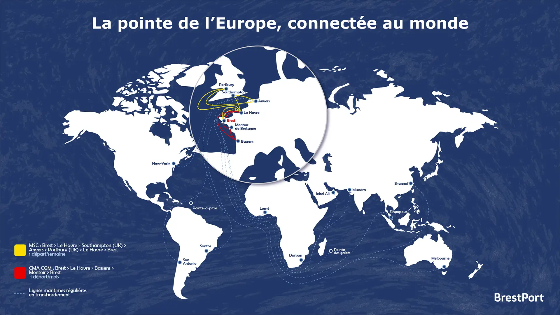Depuis 2007, la compagnie CMA-CGM fait escale à Brest dans le cadre de son service Atlantic Feeder pour faire escale au Havre pour transbordement à destination / en provenance du monde entier.